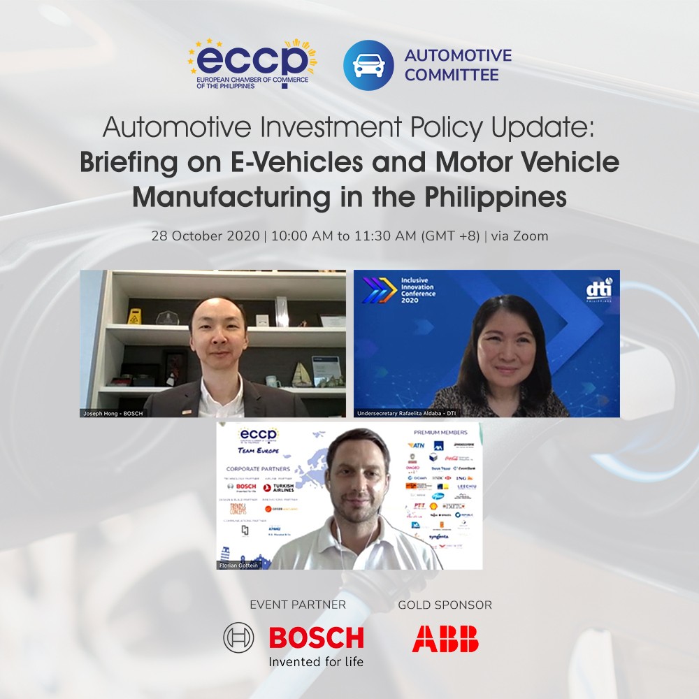 Hosted by the ECCP Automotive Committee, this online session with Department of Trade and Industry Undersecretary Rafaelita Aldaba featured updates on the various policy options to develop the budding e-vehicles industry and the proposed adjustments in the CARS program against the backdrop of the ongoing coronavirus pandemic. This webinar was made possible by our Event Partner Robert Bosch and Gold Sponsor ABB Philippines.